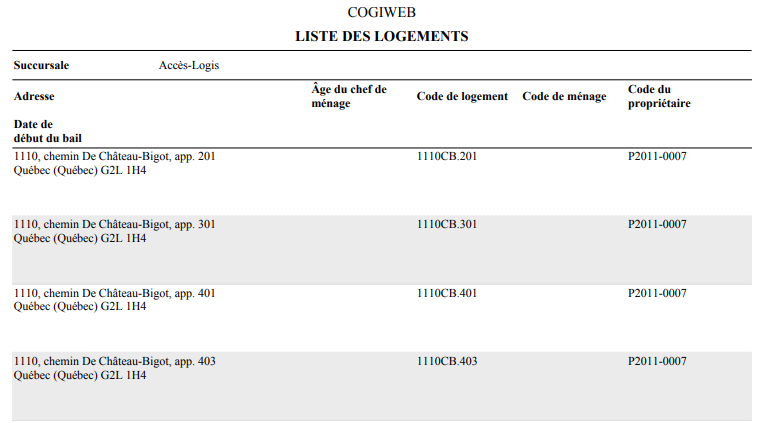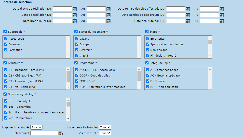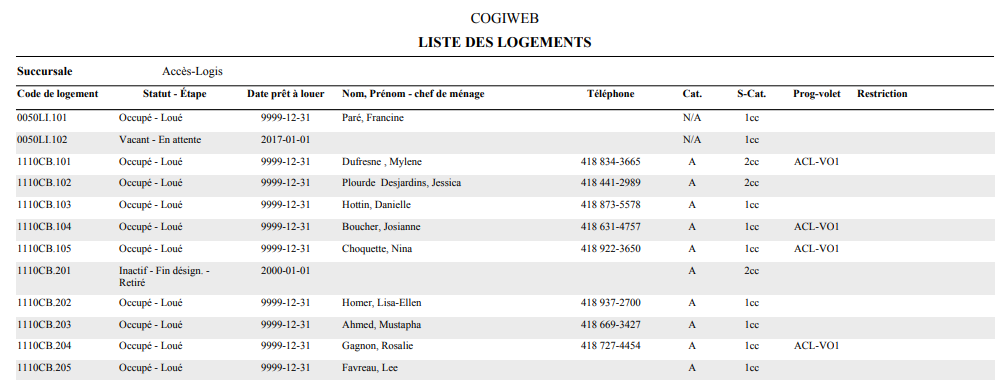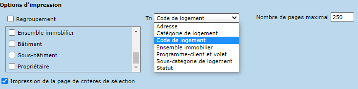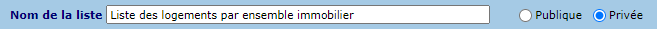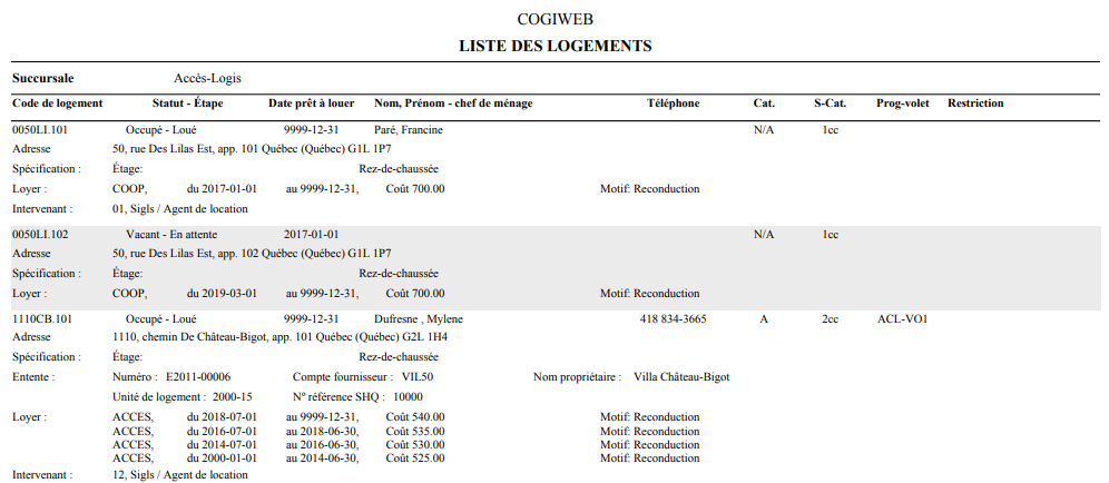 La liste des logements permet d'imprimer ou exporter une liste de logements, selon différents critères de sélection. Par ailleurs, des listes personnalisées de logements peuvent être enregistrées.