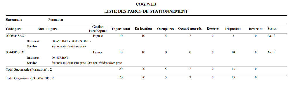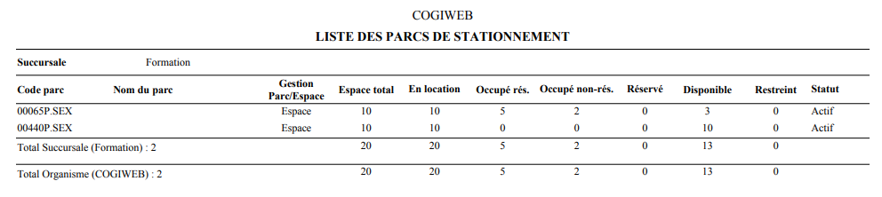 Le format sommaire fournit les informations de base pour chaque parc de stationnement. Une ligne d'information est présentée pour chaque parc de stationnement.