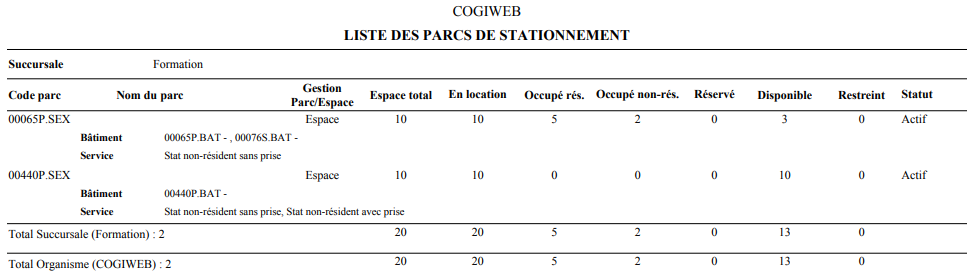 La liste des parcs de stationnement permet d'imprimer ou exporter une liste de parcs de stationnement, selon différents critères de sélection. Par ailleurs, des listes personnalisées de parcs de stationnement peuvent être enregistrées.