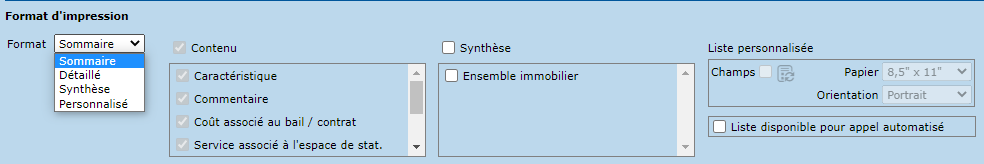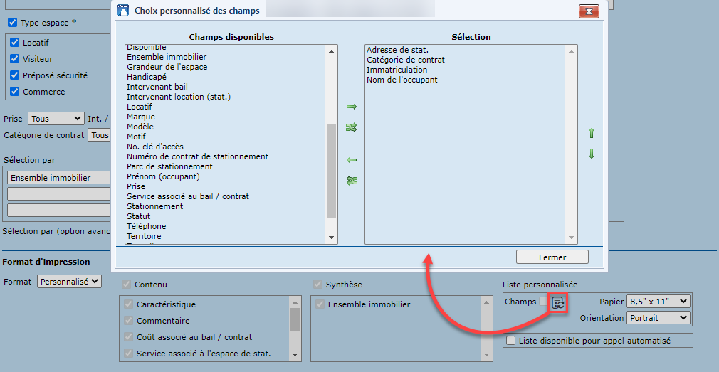 Le format personnalisé permet de définir les champs à afficher dans la liste, et offre ainsi plus de flexibilité. Pour ce faire, il suffit de cliquer sur la liste de valeurs, et déplacer les champs désirés dans la liste des champs disponibles vers la liste "Sélection" à l'aide des flèches prévues à cet effet.