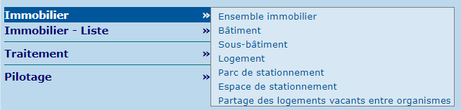 La section "Immobilier" contient les principaux écrans du module Immobilier permettant de gérer les différentes entités immobilières de l'organisme.