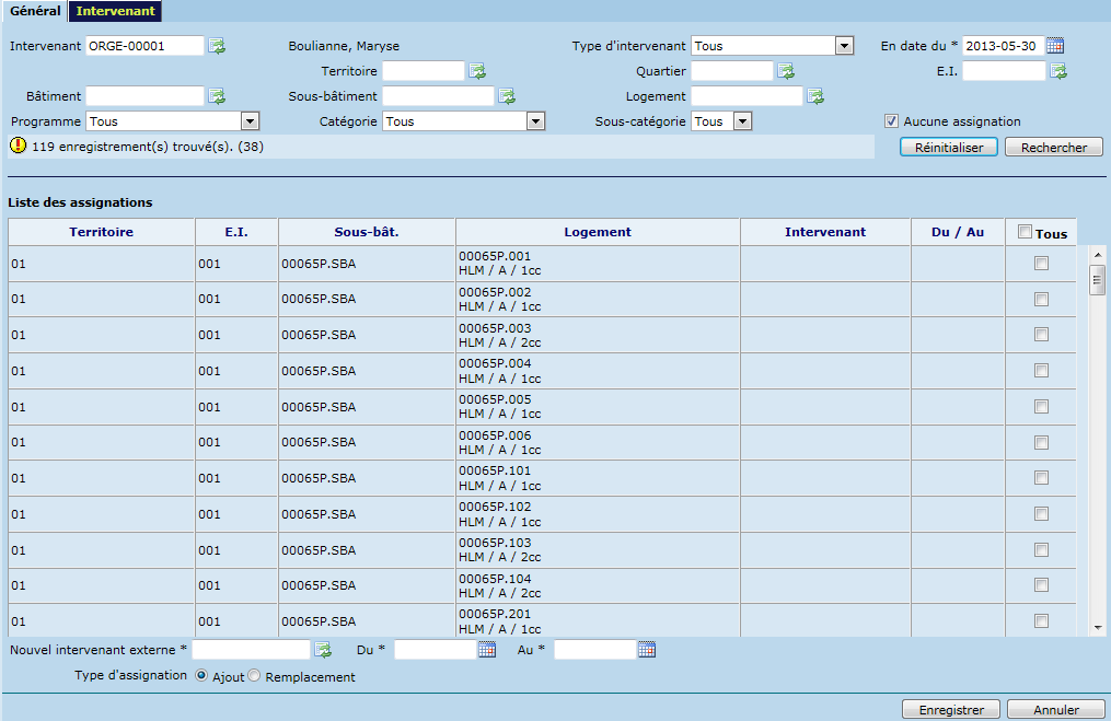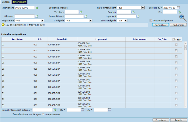 L'onglet "Général" permet de rechercher les assignations d'intervenants employés selon des critères comme un ensemble immobilier, un bâtiment, un sous-bâtiment ou un logement en particulier.