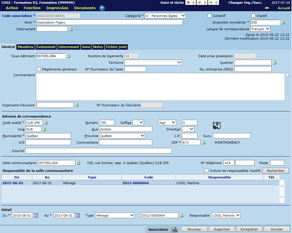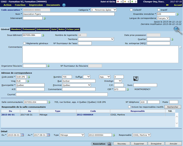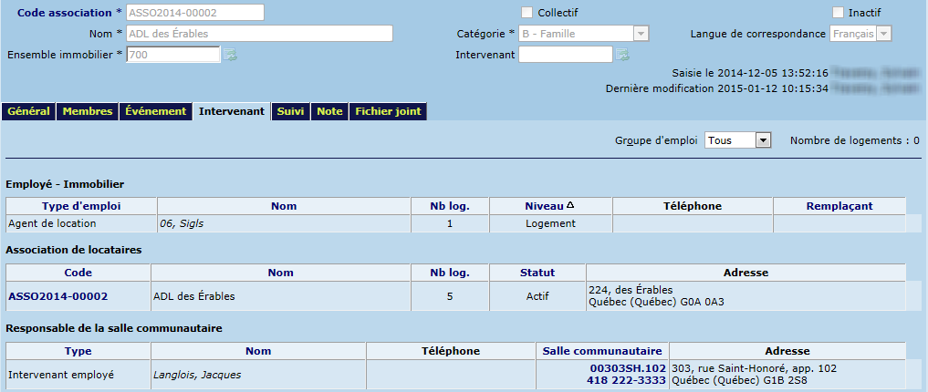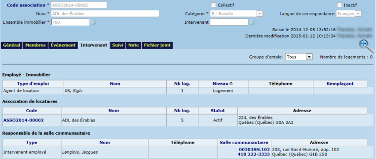 Les responsables de la salle communautaire peuvent être saisis dans l'écran "Association de locataires" sous l'onglet "Général" ou encore dans l'écran "Logement", sous l'onglet "Salle communautaire". À noter que ces deux écrans présentent la même information.