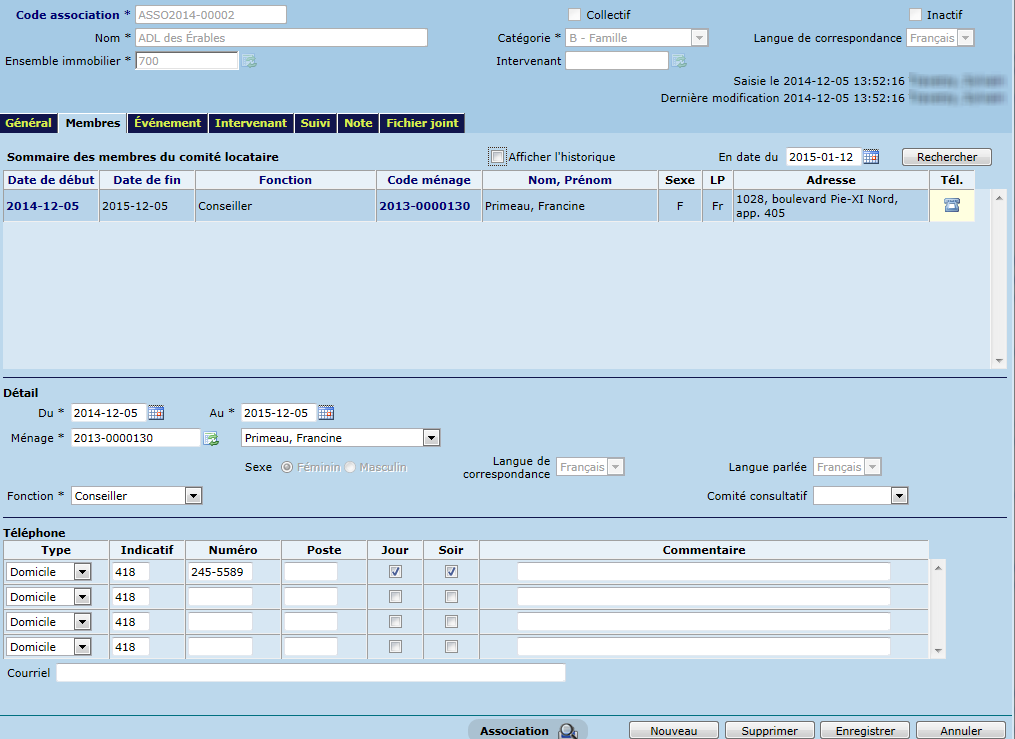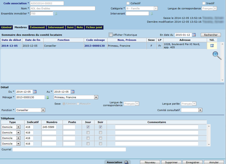 L'onglet "Membres" permet de saisir les membres du conseil d'administration du comité de locataires pour le terme d'un mandat, c'est-à-dire avec une date de début et de fin, afin d'administrer les activités de l'association. À la saisie d'un membre, le système affichera automatiquement le sexe, la langue de correspondance et la langue parlée de celui-ci. À titre indicatif, un membre représente un ménage qui occupe une fonction (pilotable sous "Intervenant -> Pilotage -> Fonction du membre") dans l'association. Un membre peut également être un élu "Représentant" ou "Substitut" du comité consultatif.