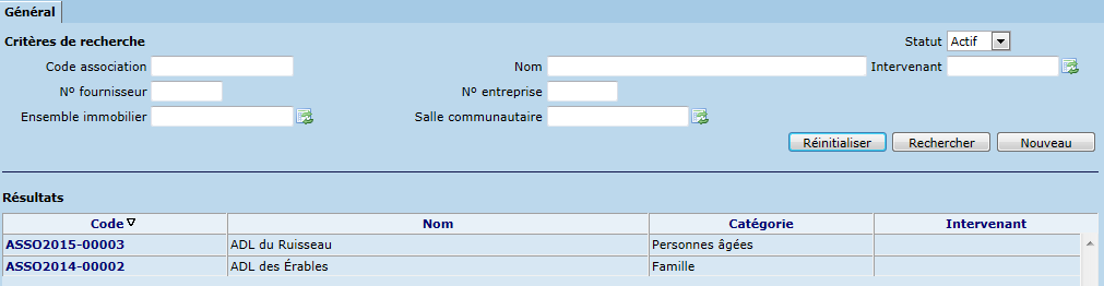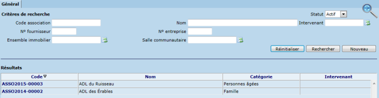 L'onglet "Général" permet de rechercher une association selon divers critères tels que le code d'association, la salle communautaire et l'intervenant.