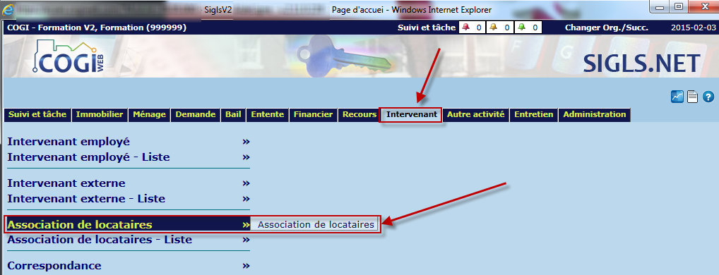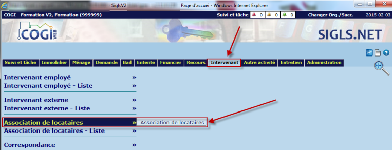 Cette rubrique présente les différents éléments de l'écran "Association de locataires" du module "Intervenant".