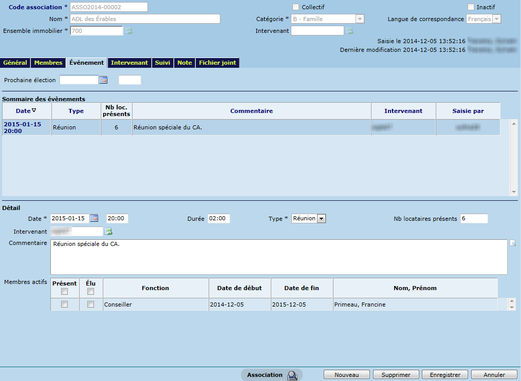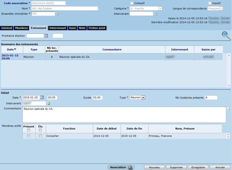 L'onglet "Événement" permet de saisir différents types de rencontres (pilotable sous "Intervenant -> Pilotage -> Type d'intervenant"), en l'occurrence une réunion, une élection ou autre, pour une date précise. Il est possible de préciser l'heure et la durée de la rencontre, le nombre de locataires présents, l'intervenant associé et inscrire un commentaire. S'il existe des membres actifs, il est possible de préciser rapidement si les membres en question sont présents et/ou élus lors de l'événement en cochant les cases "Présent" et/ou "Élu".