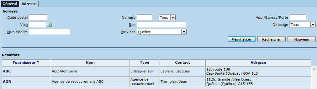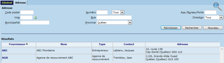L'onglet "Adresse" permet de rechercher un fournisseur selon des critères de recherche comme le code postal, le nom de rue ou la municipalité.