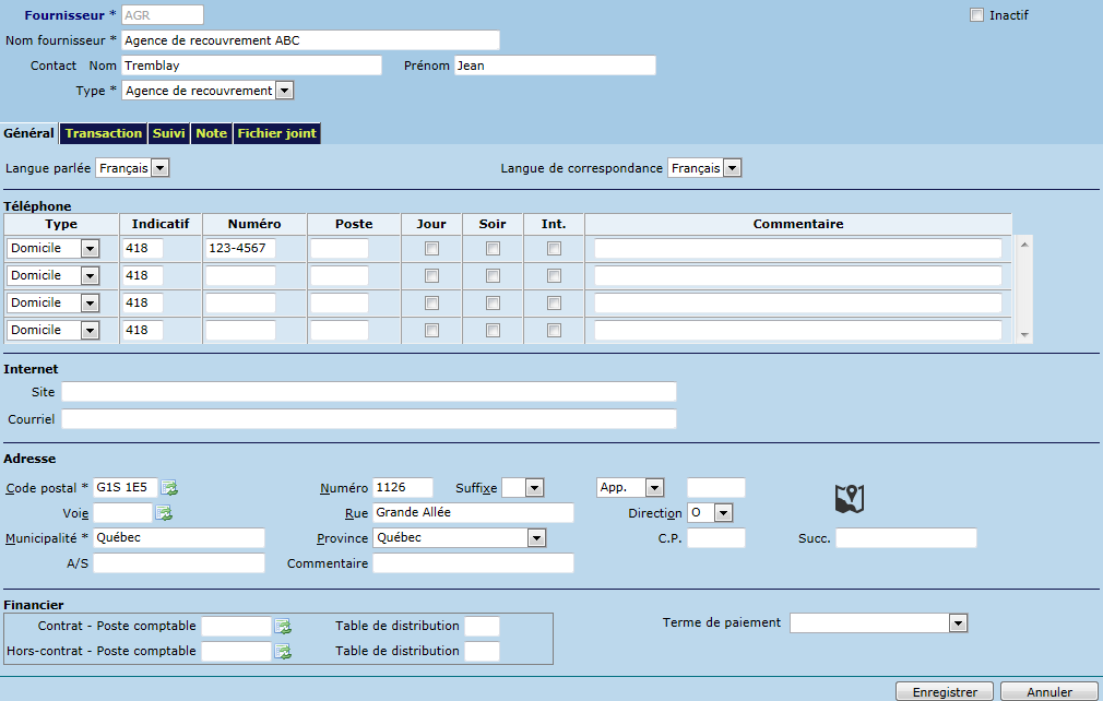 L'onglet "Général" présente les informations générales du fournisseur. Ces informations incluent le type de fournisseur, la langue de correspondance, la langue parlée et les informations de contact du fournisseur.