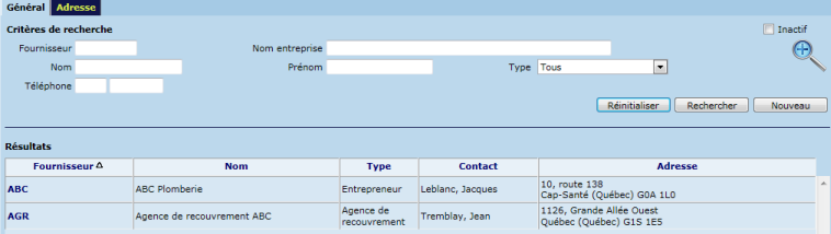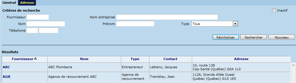 L'onglet "Général" permet de rechercher un fournisseur par nom d'entreprise, numéro de téléphone ou nom/prénom de la personne responsable. La case à cocher "Inactif" permet de rechercher uniquement les fournisseurs inactifs.