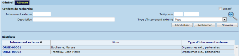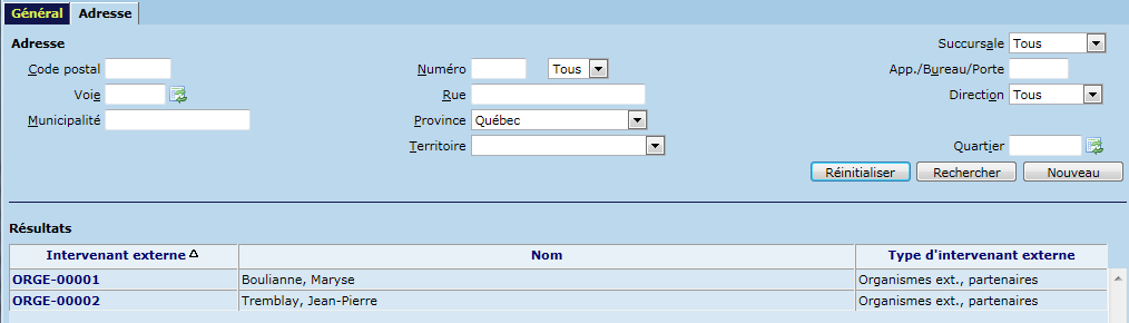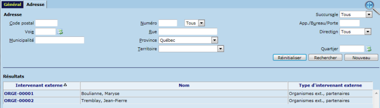 L'onglet "Adresse" permet de rechercher un intervenant externe selon des critères de recherche comme le code postal, le nom de rue ou le territoire.