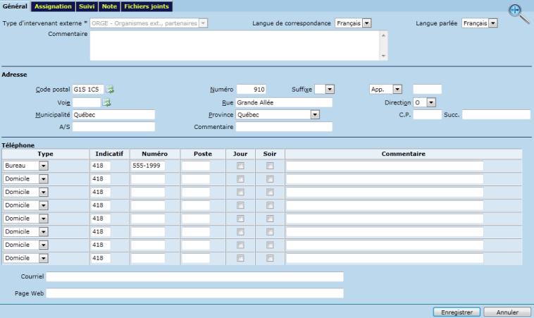 L'onglet "Général" présente les informations générales de l'intervenant externe. Ces informations incluent le type d'intervenant externe, la langue de correspondance et la langue parlé de celui-ci.
