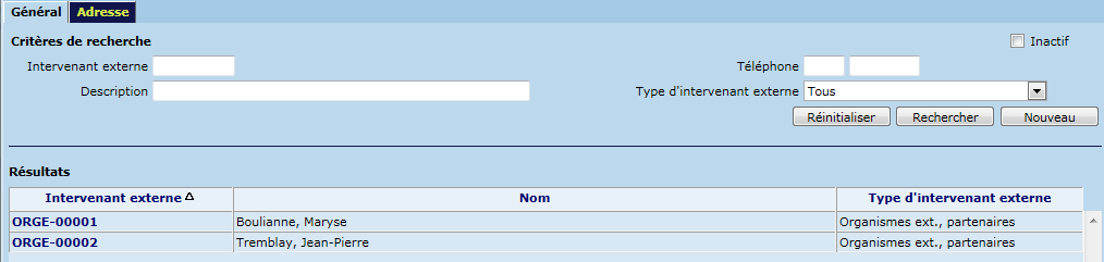 L'onglet "Général" permet de rechercher un intervenant externe par code d'intervenant externe, numéro de téléphone, description ou type. La case à cocher "Inactif" permet de rechercher uniquement les intervenants externes inactifs (donc, avec un type d'emploi n'étant plus valide). À noter que les informations consultées peuvent être modifiées, selon les droits d'accès.