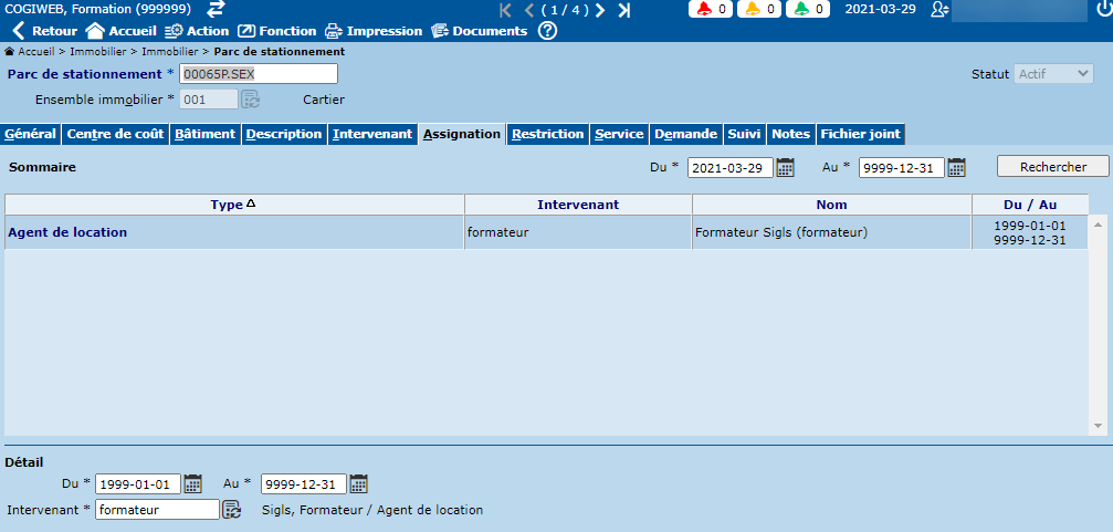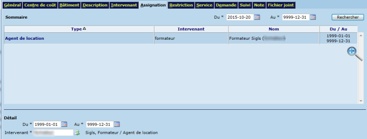L'onglet "Assignation" permet de consulter la liste des assignations de l'intervenant au niveau de l'immobilier, pour une date en particulier. L'information peut être présentée de façon sommaire ou détaillée.