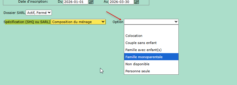 | Tableau récapitulatif (SHQ) | Affiche le tableau récapitulatif des types d'accompagnement, des motifs de fermeture et des compositions du ménage pour la SHQ. Cette liste de données est déterminée de base par la SHQ. |