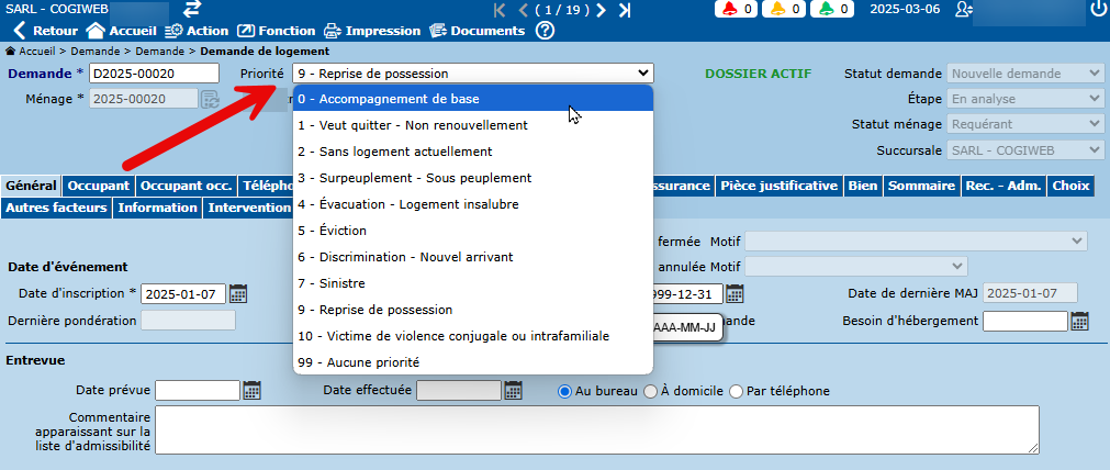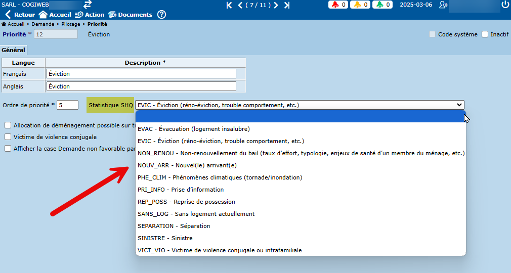 Dans les demandes de type SARL, la priorité réfère plutôt au motif d'ouverture de dossier. Afin que l'information soit transmise à la SHQ, on doit associer une "Statistique SHQ" à chaque priorité.