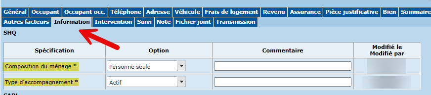 Dans l'onglet "Information" des dossiers SARL, il y a 2 spécifications SHQ pour lesquelles il est obligatoire d'inscrire une réponse. Les informations saisies dans cet écran se retrouveront sous forme de tableau dans le fichier d'exportation des statistiques SARL. Chaque organisme peut piloter ses propres spécifications. Consulter cet rubrique pour le pilotage des spécifications.