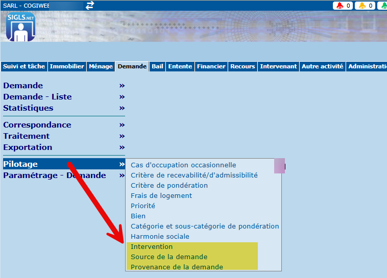 Il est possible d'ajouter des "Source", des "Provenance" ainsi que des types d'intervention afin de répondre à vos besoins spécifiques. L'ajout se fera via le menu "Pilotage" de l'onglet "Demande".