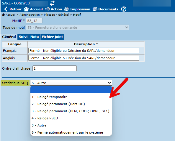 Pour ce faire, accéder à l'onglet Administration, menu Pilotage - Général et sélectionner "Motif". Pour chaque motif de fermeture, associer la statistique SHQ.