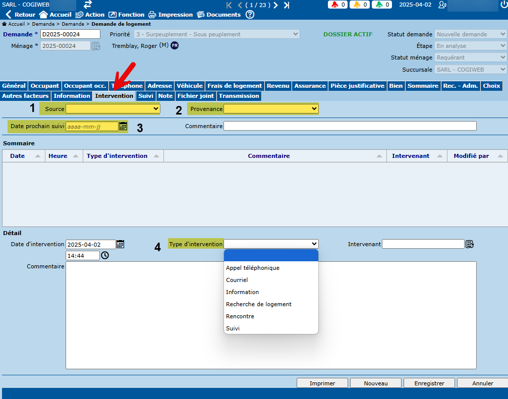L'onglet intervention vous permettra de consigner la source et la provenance de la demande SARL ainsi que les actions entreprises dans la gestion du dossier SARL.