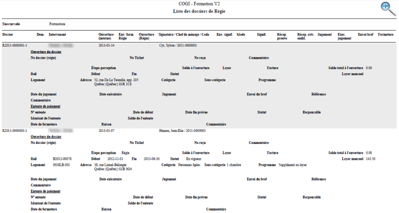 Le format détaillé fournit les informations de base et des informations complémentaires pour chaque dossier TAL. Par ailleurs, le format détaillé permet d'afficher ou non les informations suivantes :