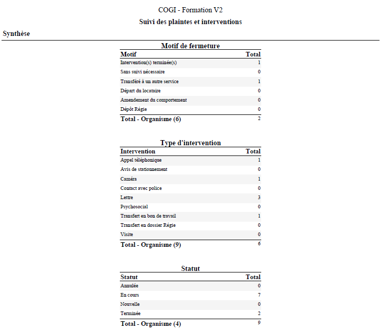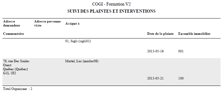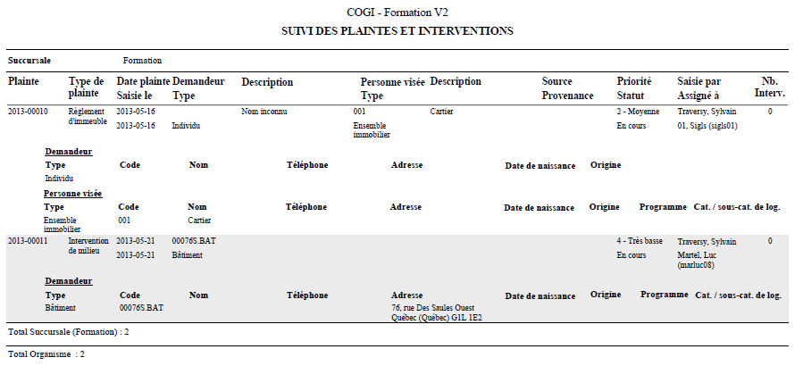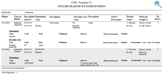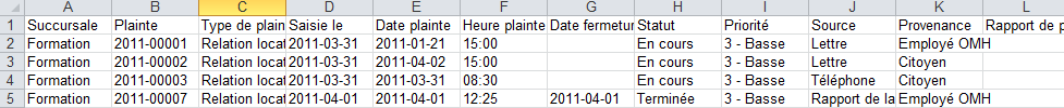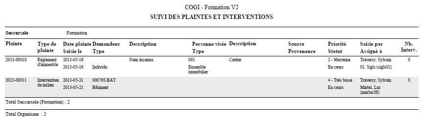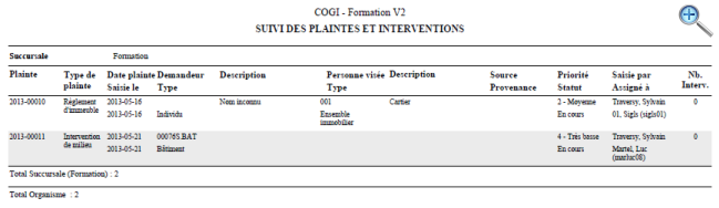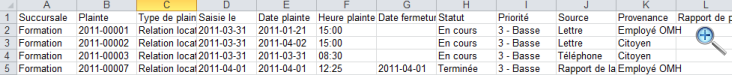 Le format sommaire fournit les informations de base pour chaque plainte et intervention.