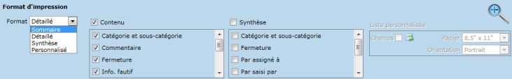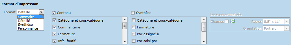 Le format détaillé fournit les informations de base et des informations complémentaires pour chaque plainte et intervention. Par ailleurs, le format détaillé permet d'afficher ou non les informations suivantes :