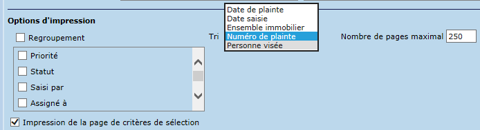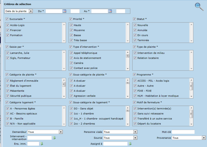 Le suivi des plaintes et interventions peut être trié selon les critères suivants :