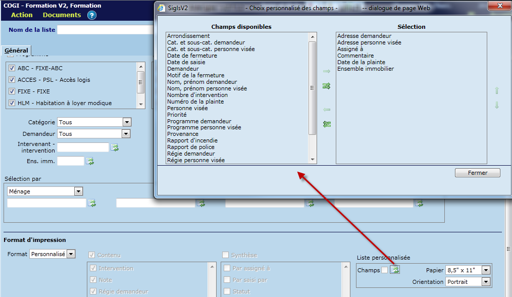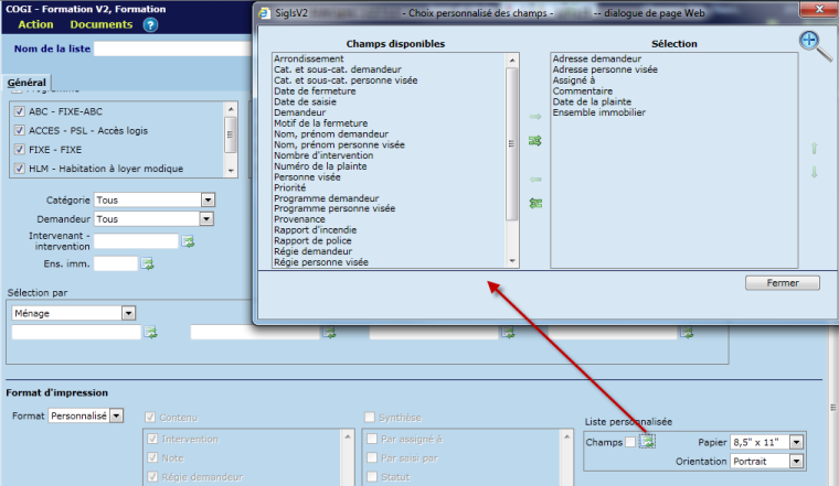 Le format personnalisé permet de définir les champs à afficher dans la liste, et offre ainsi plus de flexibilité. Pour ce faire, il suffit de cliquer sur la liste de valeurs, et déplacer les champs désirés dans la liste des champs disponibles vers la liste "Sélection" à l'aide des flèches prévues à cet effet.