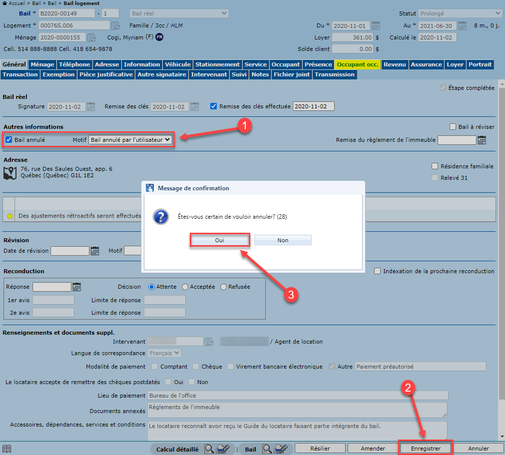 Il est possible d'annuler un bail seulement si la case "Bail annulé" est disponible. Pour annuler un bail, il suffit de cocher la case en question, sélectionner un motif d'annuler et enregistrer. Une fenêtre vous demandera de confirmer l'annulation.
