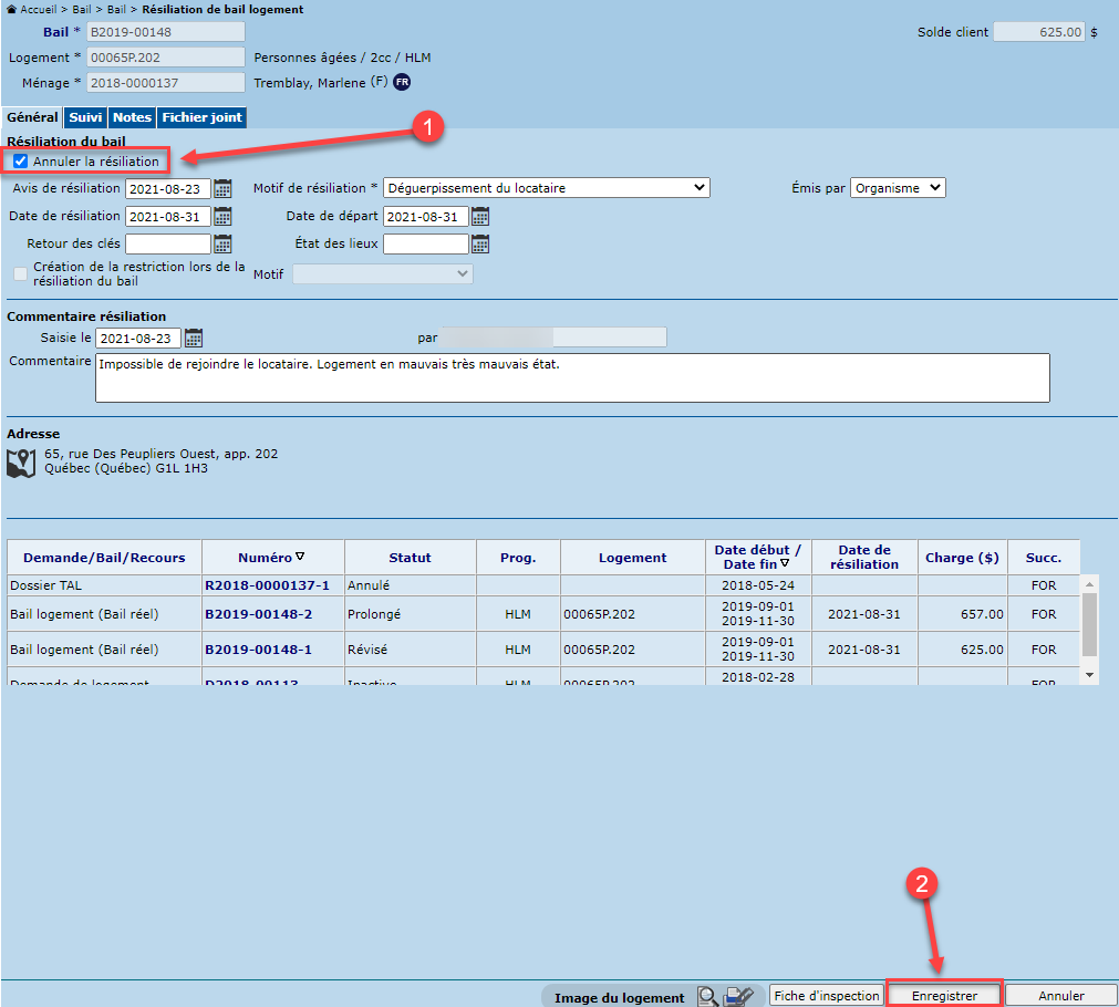 - À l'enregistrement, le statut du bail "En vigueur" passera à "En résiliation" si la date de résiliation n'est pas atteinte, ou à "Résilié" si la date est atteinte.