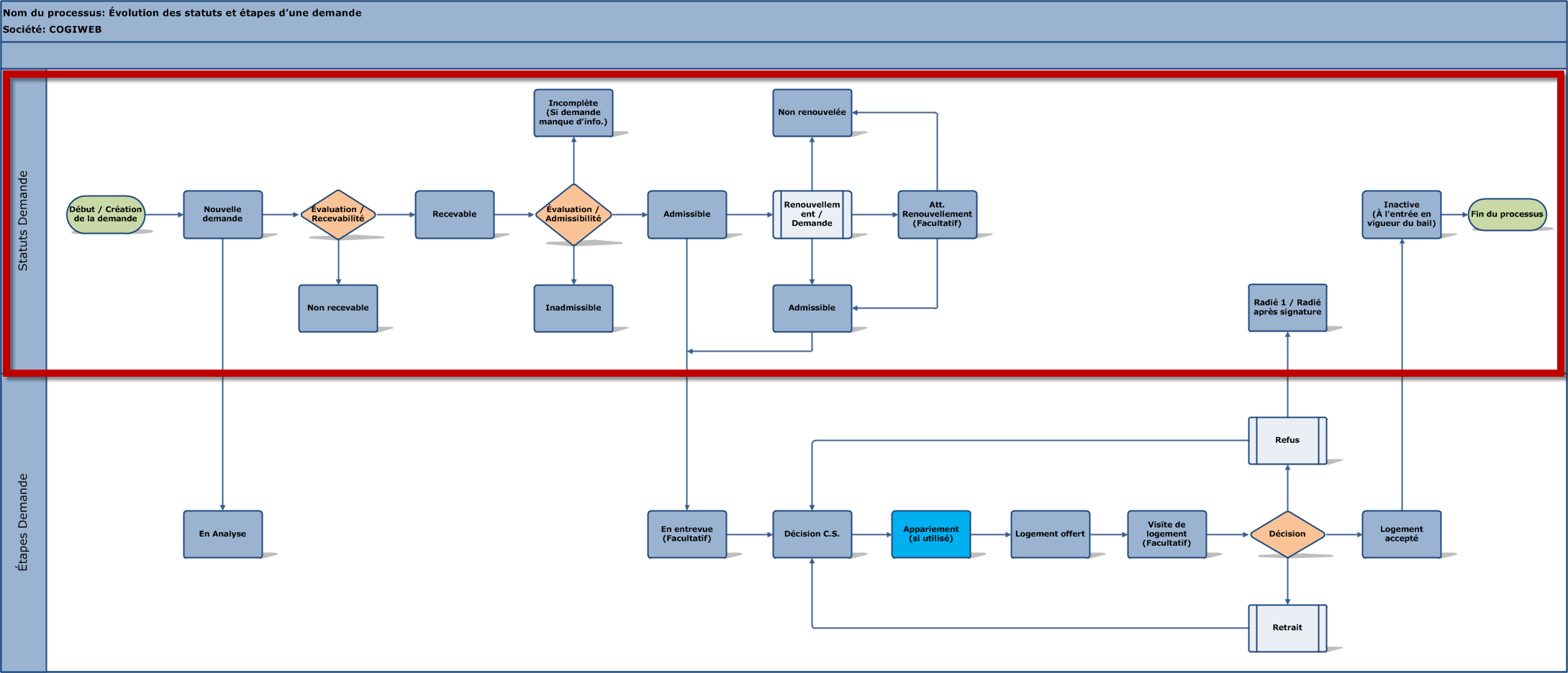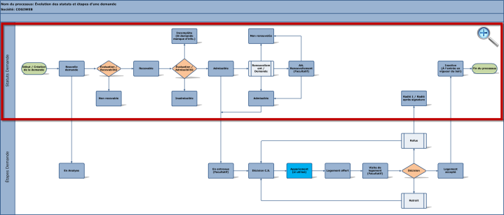 L'encadré rouge dans le diagramme ci-dessous présente les différents statuts par lesquels une demande de logement peut passer :