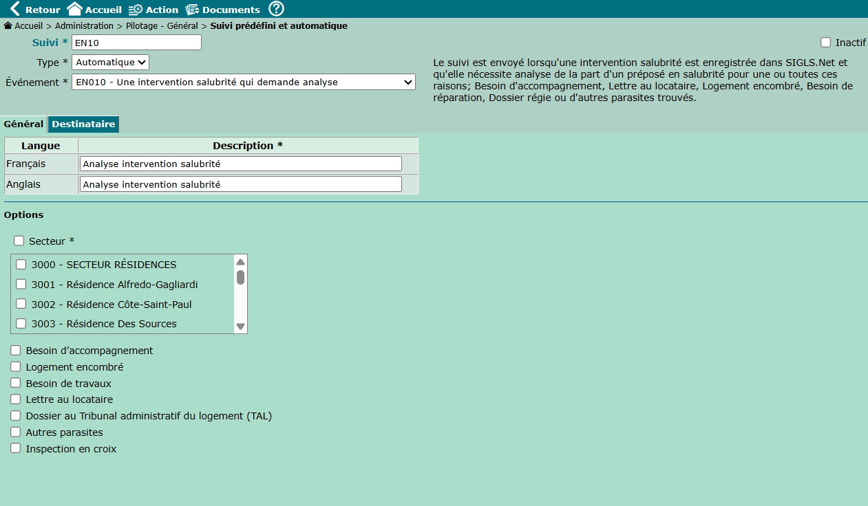 | Administration | S-15322 | Suivi prédéfini et automatique (OMHM seulement) | Ajouter l'option "Secteur" dans le suivi automatique EN010 L'ajout de l'option "Secteur" dans le suivi automatique EN010 permet d'indiquer si une intervention de salubrité nécessite une analyse. ![]() |